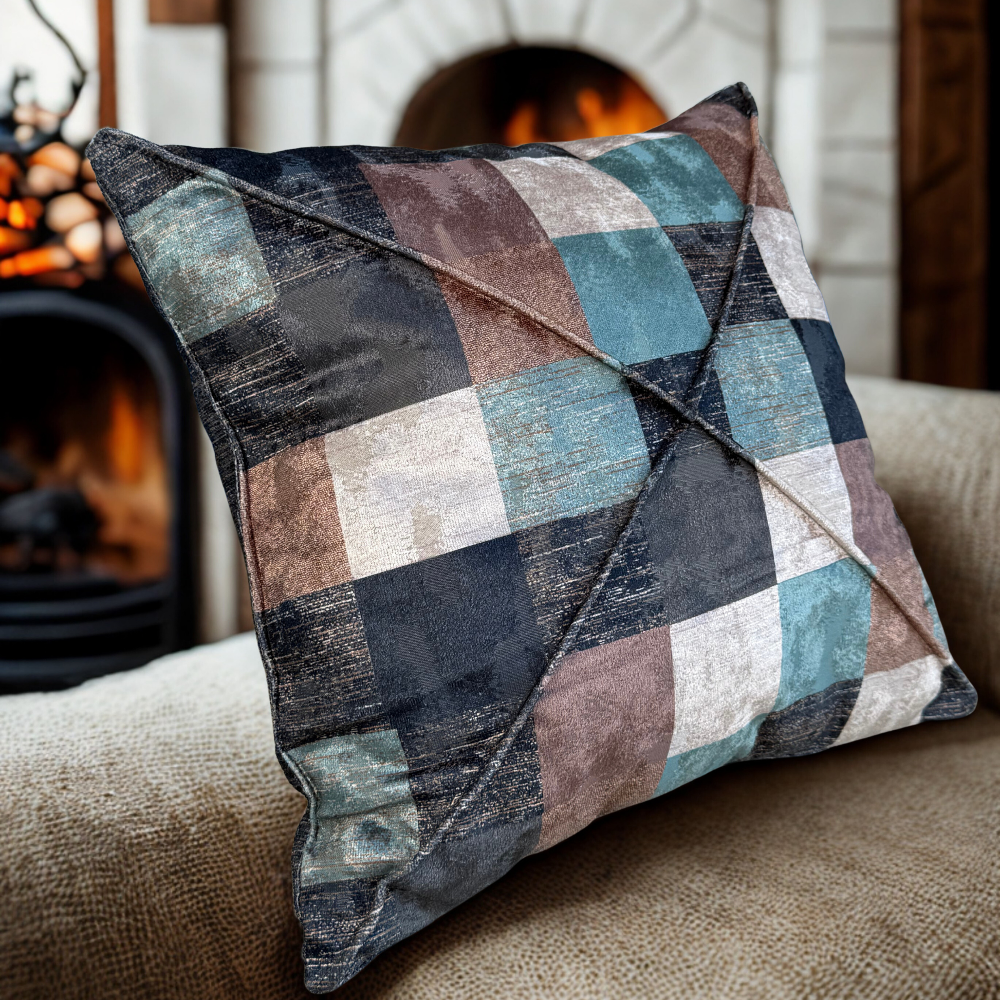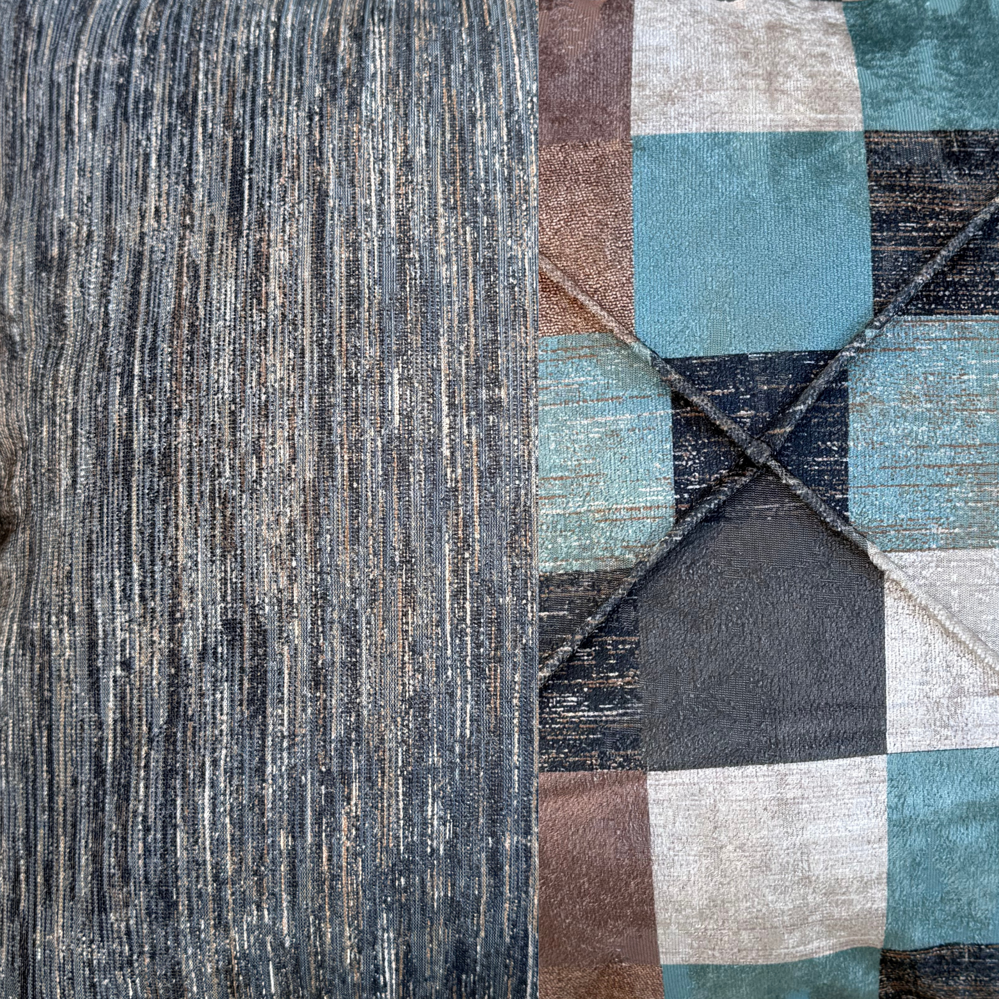 Ön yüzünde ekose desenli lüks kadife kumaş, arka yüzünde ise kendinden çizgili yumuşak dokulu kumaş kullanılarak hem modern hem de sıcak bir görünüm elde edilmiştir.